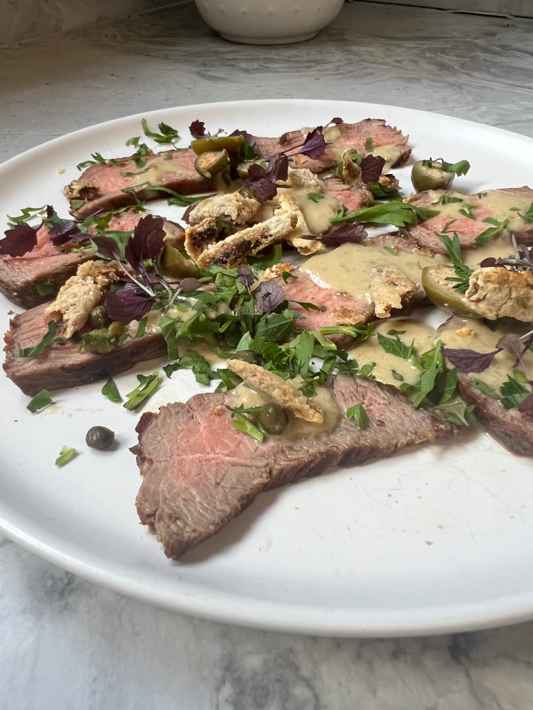 RARE GRILLED VEAL WITH A CAPER AND PARSLEY DRESSING & CRISP FRIED ANCHOVIES